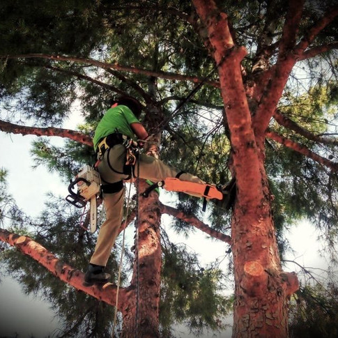 Aclarado de un grupo de pinos con moto sierra y serrucho cuyas copas se encontraban en una cantidad excesiva de ramas secas, además del crecimiento que ha experimentado en todos estos años, con este aclarado conseguimos un mejor impacto visual del grupo de árboles, además de descargar al árbol de un excesivo peso.